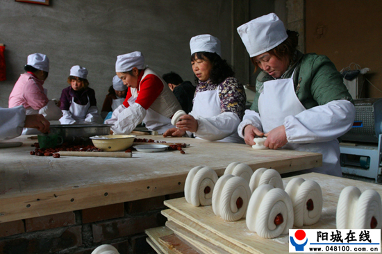 每次我们家制作枣糕时,前一天就开始准备了,父亲去村里借两个大火炉子,让我到门外炭池里准备几箩筐炭,妈妈去借几块大案板,还有制作枣糕的小片子工具、大红枣等。晚上,母亲指挥我们支起架子,把几块大案板放在架子上拼凑成七八米长、二三米宽的大案板,周围放上十几把椅子。父亲把两个炉子烧得很旺,母亲在厨房调酵母。哪家今年枣糕蒸得不错,众人口口相传,就都到他家讨现成的酵母。母亲调好了酵母,我们也做好了准备,就早早地休息,第二天要起大早的。记忆中,每次母亲晚上都睡不着觉,不时起身看看炉火,看看蒸笼屉。半夜三四点,她就一个人起来忙活了,熬一大锅小米米汤,用平时吃的面粉简单蒸一些包子,一方面准备早餐,一方面旺旺炉火,试试蒸笼屉。到了六点,帮忙的能手们陆陆续续来了,喝一碗小米粥、吃点包子后,大家就开始忙活了。两个大汉负责和面、揉面,其他婶婶阿姨负责制作。和面需要力气,每次二三十斤的面粉,要两个人一起拿着擀面杖压过一遍又一遍,成型后,再揉揉搓搓,揪成手掌大小的小剂子分派给阿姨们,由她们加工制作。有时家里做枣糕时,我已放寒假回家,也会过来凑热闹,羡慕阿姨们做出漂亮俊俏的枣糕,我也学着样子做,但是做完后,总被阿姨们无情地搓掉重做。当第一锅出来时,大家都会很关注,看看馍馍样子白不白、味道甜不甜、刚才的酵母放多了还是少了。味道好了,大家又像个艺术家一样信心十足地继续做自己的作品。过年时,亲戚间相互赠送枣糕,也是显示各位巧妇的实力。