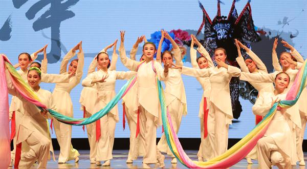 压轴戏戏曲舞蹈《袖舞翩跹》,将古典舞身韵和戏曲长水袖结合起来,通过舞者优美的身韵,将观众带入诗意灵动的世界,也与开场《戏韵》作了呼应。