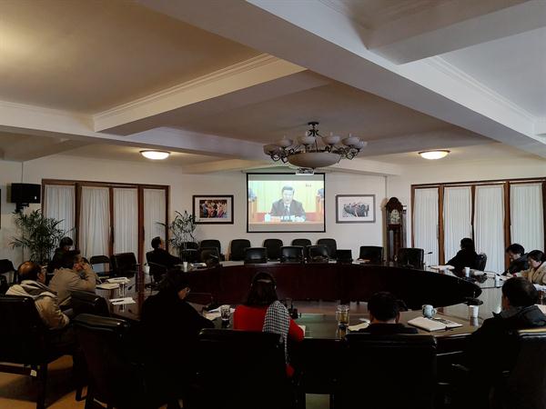 校党委班子成员、副处以上干部60余人在行政楼三楼大会议室集中观看大会直播。“改革开放铸就的伟大改革开放精神,极大丰富了民族精神内涵,成为当代中国人民最鲜明的精神标识!”总书记的讲话用“10个始终”回顾40年改革历程,总结了“9大启示”、“9条宝贵经验”。“我们这么大一个国家,就应该有雄心壮志。”“伟大梦想不是等得来、喊得来的,而是拼出来、干出来的。”大家纷纷表示,要更加紧密地团结在以习近平同志为核心的党中央周围,深入学习贯彻习近平新时代中国特色社会主义思想,始终坚定地支持改革开放、服务改革开放、投身改革开放,不断加强学习,努力提升人才培养务水平,增强办好人民满意的教育的能力,在自身领域发挥作用和特长。