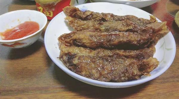 还有一道特色菜是豆腐皮包,豆腐皮包用义乌特产的豆腐皮摊开包上馅料,放进锅里油炸,馅料一般为野菜、萝卜、青菜。豆腐皮色如玉、薄如翼、滑如脂,古代还是朝廷的贡品。今天更是远销全国各地,成为餐桌上一道鲜美的佳肴。