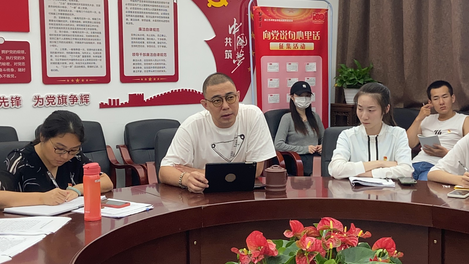 教师党员齐帅表示,作为一名专业老师,要把文化自觉,文化自信传递给每一位学生,在教育教学过程中要牢记向学生传递中华优秀传统文化,提升学生的民族荣誉感和自豪感。教师党员白骏表示,在产教融合,校企合作中要体现文化先行;在专业教学中渗透思政元素,从教材把握、教学设计过程中嵌入爱党爱国情怀,让文化先行有根本保障。辅导员王玉簪表示,对于学生思想工作,要讲究方式方法,结合学生专业背景和个人背景,把育教于学用于实践,进行更有效的引导。组织员江晓新表示,作为一名艺术类院校的基层党务工作者,要守好红色根脉,传承红色基因,要培养一批批具有高尚情怀,爱国主义思想的艺术人才后备军。教务员苏珊珊表示,作为一名教育工作者,我们担负着培养有信仰、有情怀、有担当的高素质文艺人才,传承中华民族优秀传统文化的使命,推动文化浙江更快更好地发展。