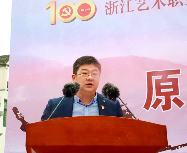 夏开堂作讲话,他代表学校,向参与话剧创作和演出的老师们、同学们致以问候,向中共长兴县委宣传部、长兴县文旅体局、长兴县文旅集团、长兴县煤山镇人民政府表示感谢。浙艺作为全国唯一一所入选“双高计划”的综合性高职艺术院校,话剧《清溪谣》的创作是戏曲表演专业建设群的一项成果。在全党上下正在开展党史学习教育之际,话剧《清溪谣》开排适逢其会,他要求浙艺师生们讲好中国共产党故事,创作和演绎展示党的伟大历程、伟大成就的优秀作品,为“文化浙江”“诗画浙江”建设提供有力人才支撑,在浙江“重要窗口”建设中发出浙艺声音、贡献浙艺智慧。