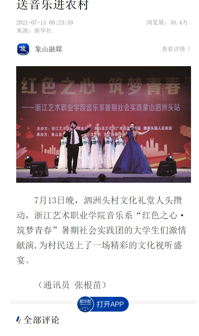 浙艺暑期社会实践活动得到人民日报、新华社等媒体广泛关注,新闻报道在人民日报客户端、新华社客户端陆续发布。