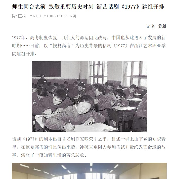 杭州日报:师生同台表演 致敬重要历史时刻 浙艺话剧《1977》建组开排