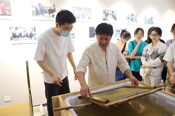 展览现场,朱中华为现场师生讲授了富阳竹纸制作技艺的发展历史,讲述从一根毛竹制作成一张纸的精细工艺和高超技术要求。同时带领现场师生体验“抄纸”流程,感受传统技艺的魅力。