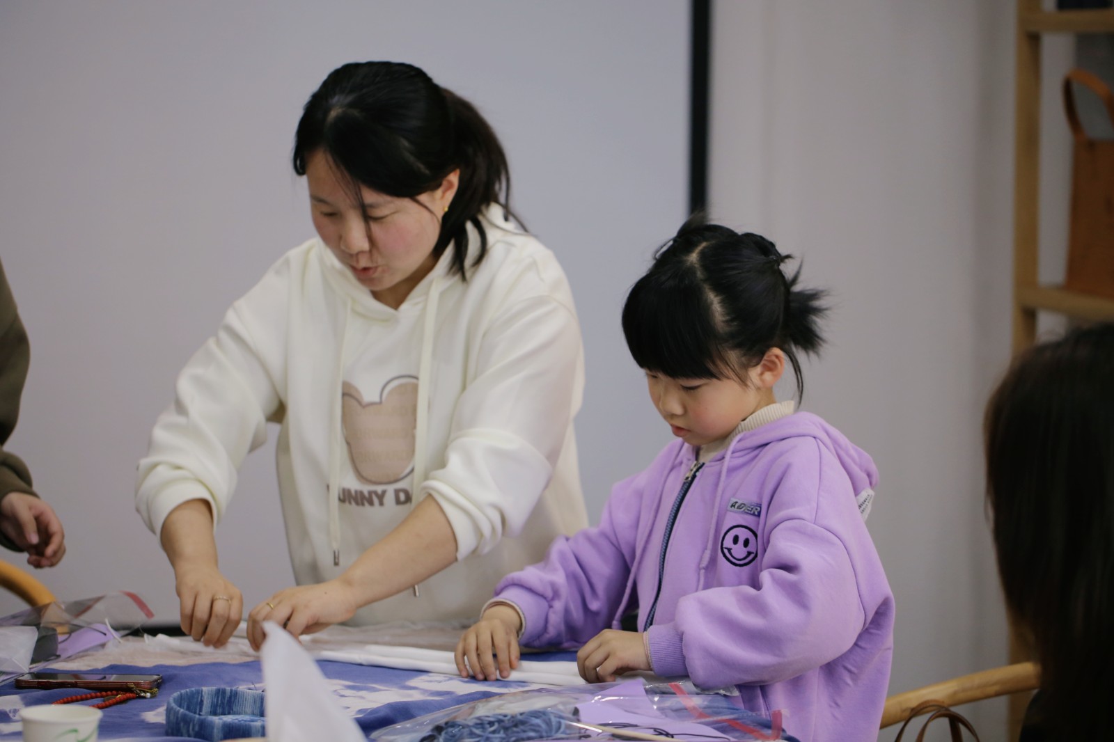 胡锦霞对蓝染制作技艺进行讲解,将“从传统中来,到现代中去”的理念放入蓝染实操体验课中。校友们经过不断询问和尝试,使用橡皮筋、木筷等工具将白色面料扎成喜爱的图案,最后浸泡入染料。在等待作品出炉时,大家还制作起了手工艺小饰品,蓝染粘贴或捆绑的纽扣、头绳和发箍纷纷问世,现场一片欢声笑语。